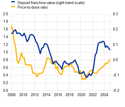 Banks’ deposit franchises can act as a stabilising force in the banking system by supporting profitability and containing interest rate risk. The value of a bank’s deposit franchise is defined as the long-term present value of its earnings from attracting and retaining low-cost and stable deposit funding, minus any operating expenses incurred (e.g. due to operating branches and marketing expenses). In providing steady, low-cost funding, strong deposit franchises are a key source of bank profitability and, as such, have contributed to the recent surge in profitability. They also help banks to manage interest rate risk in a volatile interest rate environment, as changes in the economic value of a bank’s deposit franchise can offset valuation changes in long-term fixed-rate assets. High deposit franchise values may also reduce banks’ risk-taking incentives and moral hazard by representing an economic asset that banks aim to protect, potentially resulting in higher market valuations.[1]