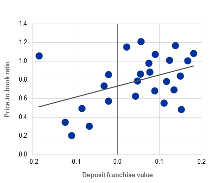 Banks with higher deposit franchise values are more attractive to investors. Higher deposit franchise values are also associated with higher market valuations, across both time and banks. Since 2008 banks’ average deposit franchise values and average price-to-book ratios have followed similar patterns (Chart B, panel a). This positive relationship also holds at the cross-sectional level, as banks with higher deposit franchise values receive higher valuations from investors (Chart B, panel b). This is relevant in terms of financial stability, as weak valuations can impede the ability of banks to raise capital and provide credit to the real economy.