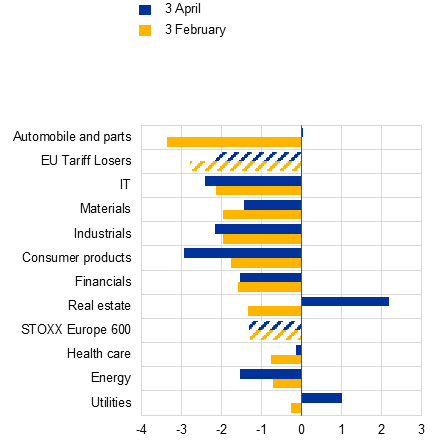 13. Chart B, panel b) focuses on the distribution of equity market responses to broad-based tariff announcements that affect a wide range of sectors. Targeted sectors have been particularly negatively affected when sector-specific tariffs have been announced. This was the case for the 10 February US announcement of tariffs on steel and aluminium imports and the 13 March threat to impose 200% tariffs on US alcoholic beverage imports from the EU. In the latter case, shares in specific European alcoholic beverage exporters fell in the 30 minutes after the threat, in some cases by around 3%, while the decline in the STOXX Europe 600 index was more muted, at around 0.3%.