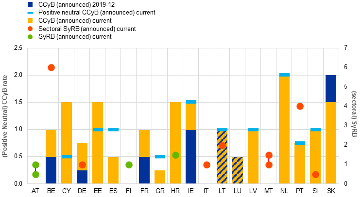 Notes: Figures refer to July 2025, unless otherwise stated. The blue bars represent the CCyB rates that had either been announced or were in place in the fourth quarter of 2019. The yellow bars represent the CCyB rates either announced or already in place as of May 2025. In LU and LT, the CCyB rate has not changed from the fourth quarter of 2019 to March 2025, hence the striped bars. The light blue dashes represent the target positive neutral CCyB rate (either announced or already in place) for the countries that have adopted such an approach to setting the CCyB. The green dots represent the SyRB rates, either announced or implemented, as of March 2025. In AT, the range of SyRB rates applying to different institutions is shown. The red dots represent the sectoral SyRB rates, either announced or implemented, as of March 2025. In IT and MT, the range of sectoral SyRB rates applying to different institutions is shown.