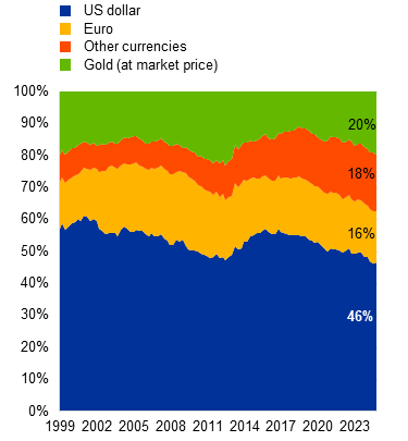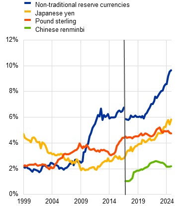 Accordingly, the share of the euro in global official holdings of foreign exchange reserves remained stable, at 20%, broadly unchanged since the start of Russia’s full-scale invasion of Ukraine. Special feature A shows that holdings of euro area government debt securities by official foreign investors have remained generally resilient since Russia’s invasion, reaching almost €1 trillion (or more than one-third of foreign holdings of euro area government debt securities) at the end of 2024. The decline in holdings by countries not geopolitically aligned with the West – around 5% compared with pre-invasion levels – has so far been contained, highlighting the importance of upholding the rule of law. Meanwhile, the share of the US dollar in global official holdings of foreign exchange reserves declined by 2.0 percentage points at constant exchange rates, to 57.8% (Section 1.1). The share of the renminbi stood at 2.2%, 0.4 percentage points below its 2022 peak. Surveys of official managers point to China’s deteriorating economic outlook as one factor that has weighed on the renminbi’s appeal as a reserve currency. Diversification into non-traditional reserve currencies such as the Australian dollar and the Canadian dollar continued, with their combined share rising to 9.6% – an increase of 2.4 percentage points compared with the levels seen before Russia’s invasion.