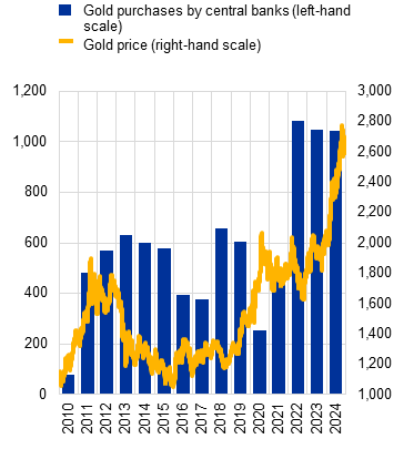 Box 1 shows that central banks continued to accumulate gold at a record pace. Central banks purchased more than 1,000 tonnes of gold in 2024, which is double the average annual amount seen in the previous decade. Global holdings of gold by central banks now stand at 36,000 tonnes, close to the all-time high of 38,000 tonnes reached in 1965 during the Bretton Woods era. With the price of gold reaching new highs, the share of gold in global foreign reserves at market prices, at 20%, surpassed the share of the euro (16%). Survey data suggest that two-thirds of central banks invested in gold for purposes of diversification, while two-fifths did so as protection against geopolitical risk.