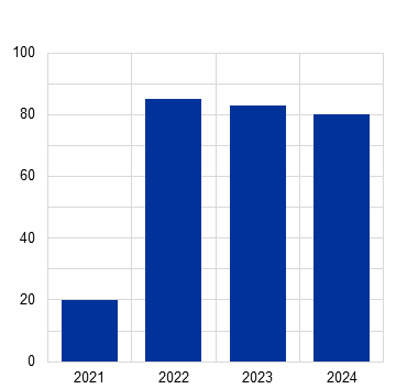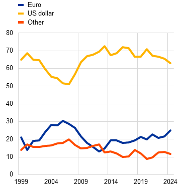 The international role of the euro remained broadly stable in 2024. The share of the euro across various indicators of international currency use has been largely unchanged, at around 19%, since Russia’s invasion of Ukraine. The euro continued to hold its position as the second most important currency globally.