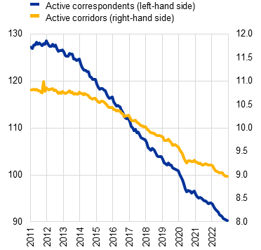 30. See Rice, T., von Peter, G. and Boar, C., “On the global retreat of correspondent banks”, BIS Quarterly Review, March 2021. Correspondent banking is an arrangement whereby one bank (correspondent) holds deposits owned by other banks (respondents) and provides those banks with payment and other services.