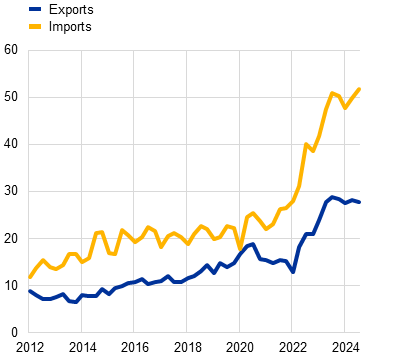 This stability was noteworthy in a year that saw the ECB begin lowering policy rates, following further declines in inflation and continuing geopolitical tensions. The accumulation of gold by central banks continued at a record pace and some countries have been actively exploring alternatives to traditional cross-border payment systems. There is evidence of a link between shifts in invoicing currency patterns in global trade and geopolitical alignments, particularly since the invasion of Ukraine. New challenges to the euro’s international role have also emerged, including initiatives promoting the global use of cryptocurrencies.