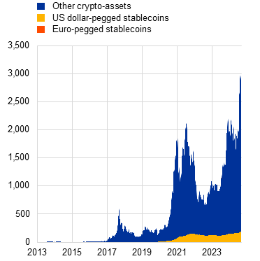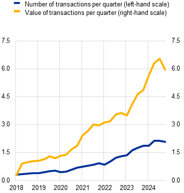 Notes: In panel a), the latest observation is for the end of 2024. In panel b), ”Defi” stands for decentralised finance. The latest observation is for 31 December 2024.