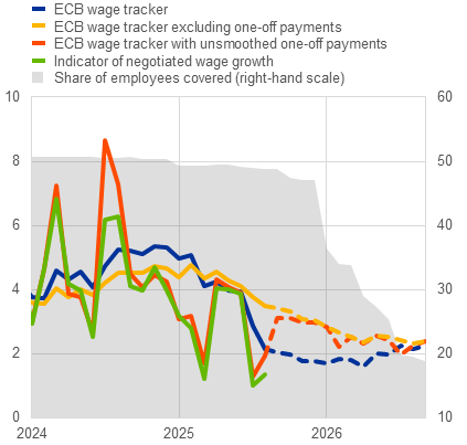 The latest reading of the European Central Bank (ECB) wage tracker, which covers active collective bargaining agreements, indicates negotiated wage growth with smoothed one-off payments of 4.7% in 2024 (based on a coverage of 50.6% of employees in participating countries) and 3.2% in 2025 (based on a coverage of 48.7%). The wage tracker with unsmoothed one-off payments indicates negotiated wage growth of 4.9% in 2024 and 3.0% in 2025. The downward trend in the forward-looking wage tracker component partly reflects the mechanical impact of large one-off payments (that were made in 2024 but not in 2025) and the frontloaded nature of wage increases in some sectors in 2024. The wage tracker excluding one-off payments indicates growth of 4.2% in 2024 and 3.9% in 2025.