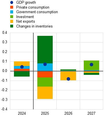 Euro area foreign demand has also been significantly revised down compared with the March projections. Growth in euro area foreign demand is expected to decline to 2.8% in 2025, from 3.5% in 2024, and to weaken further to 1.7% in 2026, before recovering to 3.1% in 2027. Compared with the March 2025 projections, euro area foreign demand growth has been significantly revised down, by 0.4 percentage points for 2025 and by 1.4 percentage points for 2026. These revisions also relate to the impact of trade displacement between the United States and China owing to higher tariffs, which does not accurately reflect potential foreign demand directed to the euro area. When the estimated impact of lower bilateral trade between the United States and China, owing to changes in tariffs since the March 2025 projections, is accounted for, downward revisions to growth in euro area foreign demand are smaller.