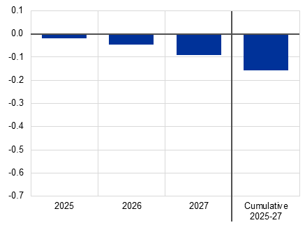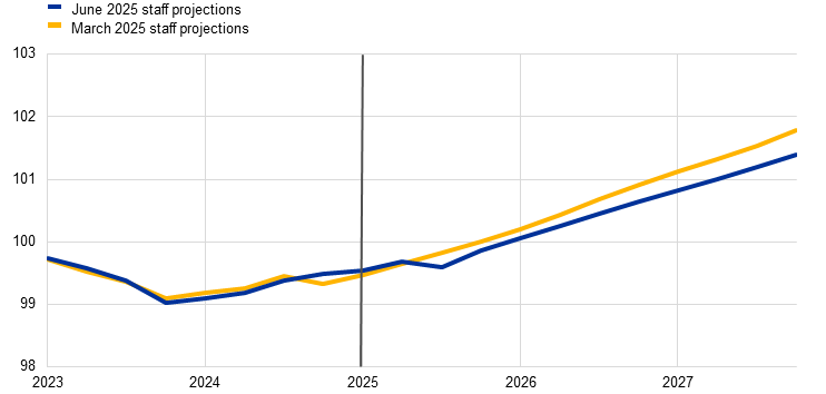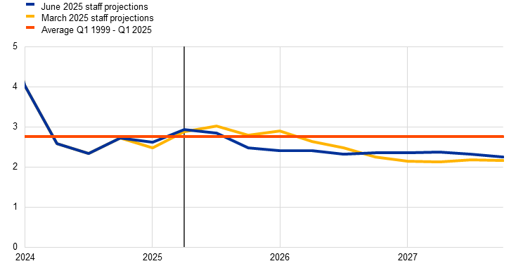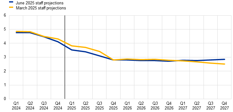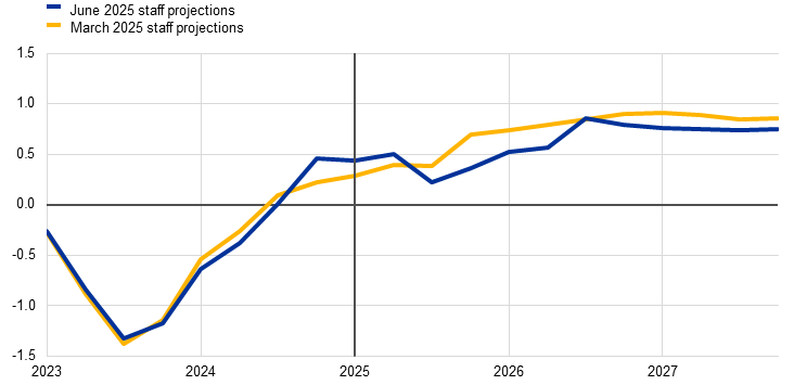 The outlook for euro area economic growth is clouded by trade tensions and elevated global uncertainty. For 2025 as a whole, these effects are seen to be partly compensated by stronger than expected economic activity in the first quarter, which likely reflects in part the frontloading of exports in anticipation of higher tariffs. In the medium term economic activity is seen to be supported by the recently announced new fiscal measures. The baseline assumes that US tariffs on EU goods, which have increased to 10%, will remain in place over the entire projection horizon. Together with the elevated trade policy uncertainty and the recent appreciation of the euro, the higher tariffs will weigh on euro area exports and investment, and, to a lesser extent, on consumption. By contrast, new government spending on infrastructure and defence, mainly in Germany, should bolster euro area domestic demand from 2026. Overall, the conditions remain in place for euro area GDP growth to strengthen over the projection horizon. In particular, rising real wages and employment, less restrictive financing conditions – mainly reflecting recent monetary policy decisions – and a rebound in foreign demand later in the horizon should all support a gradual recovery. Annual average real GDP growth is expected to be 0.9% in 2025, 1.1% in 2026 and 1.3% in 2027. Compared with the March 2025 ECB staff macroeconomic projections, the outlook for GDP growth is unrevised for 2025, reflecting better than expected incoming data which are seen to be largely offset by the effects of the trade tensions and the appreciation of the euro exchange rate. The trade tensions and the stronger exchange rate have resulted in a downward revision to growth for 2026, while growth is unrevised for 2027.[1]