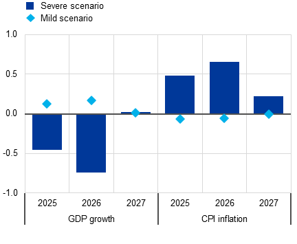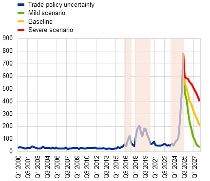 To illustrate the risks relating to US tariff policies and the current high uncertainty surrounding the euro area economic outlook, two scenarios have been prepared. A mild scenario foresees the removal of bilateral tariffs between the United States and the EU (i.e. “zero-for-zero” tariffs) and a rapid reduction in trade policy uncertainty to pre-2018 levels. Under such a scenario, growth would be 0.3-0.4 percentage points stronger in 2025-26 than in the baseline, while inflation would be marginally higher in 2026-27. A severe scenario foresees a further increase in US tariffs across the board (in line with the announcement of so-called “reciprocal” tariffs in the United States), symmetric retaliation by the EU and persistently higher trade policy uncertainty. Under such a scenario, the growth outlook would be considerably weaker throughout the projection horizon while inflation would be lower – especially later in the horizon. These scenarios are detailed in Box 2.