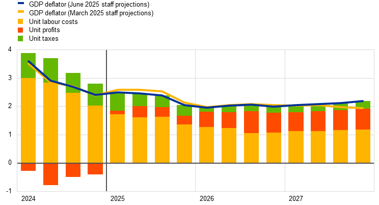 While headline inflation, as measured by the Harmonised Index of Consumer Prices (HICP), is likely to stay below 2% in the near term, it is expected to return to target in the medium term. Inflation is projected to decline in the course of 2025 and to reach a trough of 1.4% in the first quarter of 2026, before returning to 2.0% in 2027. The decline in headline inflation over 2025 is seen to be driven in part by negative energy inflation following the recent decline in oil prices and wholesale natural gas prices. Energy inflation is expected to remain negative until 2027 when new climate change mitigation measures come into effect in the context of the new Emissions Trading System (ETS2). Following a temporary increase in the second quarter of 2025, food inflation is expected to fall to rates slightly above 2% in 2027. HICP inflation excluding energy and food (HICPX) is expected to decline, driven by the services component, as the effects of delayed price adjustments for some items fade out, wage pressures recede, and lower energy prices feed through the pricing chain. Wage growth should continue to follow its downward path as pressures to recoup past real wage losses fade. Coupled with a recovery in productivity growth, this is expected to lead to significantly slower unit labour cost growth. External price pressures, as reflected in import prices, are expected to remain moderate assuming that EU tariff policies remain unchanged, with some downward pressure stemming from the stronger euro and the decline in energy commodity prices over recent months. Compared with the March 2025 projections, the outlook for headline HICP inflation is revised down by 0.3 percentage points for both 2025 and 2026 on account of lower energy commodity price assumptions and the appreciation of the euro, while it is unrevised for 2027.