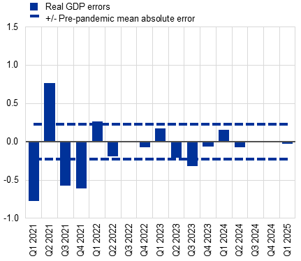 The accuracy of euro area GDP growth projections has varied since the COVID-19 pandemic, with short-term projections proving accurate but the pace of the recovery over the medium term often overestimated (Chart A). During the pandemic, up to the end of 2021, both short-term and medium-term projections exhibited unusually large errors, reflecting the challenge of projecting growth during a period of unprecedented lockdowns and re-openings. After 2022, short-term projection errors decreased substantially and have since remained below or close to the pre-pandemic mean absolute error. This suggests that, even in an environment of multiple large shocks, recent short-term GDP projections have been generally reliable, with no clear bias. By contrast, medium-term projections systematically overestimated growth between the third quarter of 2022 and the second quarter of 2024, with one-year-ahead errors exceeding the pre-pandemic mean absolute error between the fourth quarter of 2022 and the fourth quarter of 2023. These overestimations reflected optimistic expectations about the strength of the recovery after the energy crisis. In particular, in 2022 these errors were driven by weaker than expected rebounds in global trade, higher energy prices, tighter financing conditions and elevated uncertainty, compounded by the underestimated impact of inflation on real incomes. In 2023 weaker than expected foreign demand, a more restrictive monetary policy and a stronger euro also contributed to lower growth outcomes than projected.[14] Over the past year the accuracy of the one-year-ahead projections has improved significantly, albeit with a continued tendency to slightly overestimate the strength of the growth outlook.