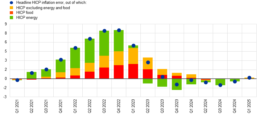 In summary, projection errors have become smaller since the second half of 2023, with the Eurosystem/ECB staff projections performing well overall, but given the ongoing shocks hitting the euro area, forecasting remains challenging. Errors were particularly large in 2021 and 2022, reflecting the impact of extraordinary and overlapping shocks. Since then forecast accuracy has improved, especially for inflation excluding energy and food, in line with the gradual dissipation of these shocks. The case of 2024 illustrates that, despite some over and underestimations, inflation projection errors have remained within historically normal bounds. That said, forecasting remains very challenging given the ongoing shocks affecting the economic outlook at both the global and euro area levels. This calls for continued caution and agility in the forecasting process, particularly in the face of high uncertainty around the evolution and transmission of these shocks.