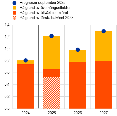 Anm.: Den vertikala linjen visar början på prognosperioden. Revideringar beräknas på ej avrundade siffror. Den randiga, röda stapeln visar effekten av utfall för det första och det andra kvartalet 2025 på tillväxten inom år 2025.