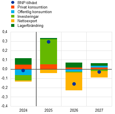 Den reala BNP-tillväxten torde fortsätta att drivas på av den privata konsumtionen. Ur ett utgiftsperspektiv (diagram 2 panel a) beräknas den privata konsumtionen öka kraftigt under hela prognosperioden, vilket ger det största bidraget till real BNP-tillväxt. Dessutom bör den offentliga konsumtionen och de totala investeringarna öka varje år från 2025 till 2027, med privata investeringar som kompenserar för den förväntade starka tröskeleffekten på offentliga investeringar 2027 till följd av att NGEU-bidraget löper ut. Däremot beräknas nettoexporten ge negativa bidrag till den reala BNP-tillväxten 2025 och 2026 – och bidraget från import (-1,2 respektive -0,9 procentenheter) överstiger bidraget från exporten (0,6 respektive 0,5 procentenheter) – men detta uppvägs delvis av ett positivt bidrag från lagerförändringar 2025 (diagram 2 panel b). De mycket volatila lagerförändringarna under 2025 hänger samman med lageruppbyggnad och lagernedskärningar i samband med tidigareläggningseffekter och avveckling av dessa.