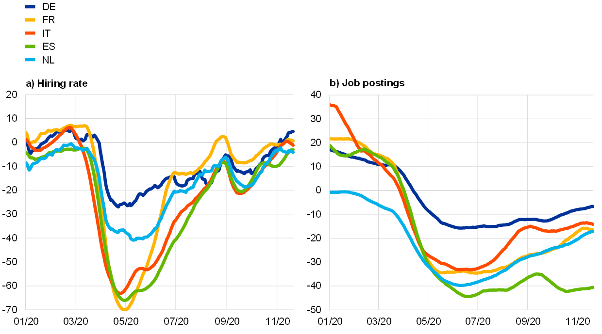 Notes: The methodology behind the high-frequency indicators on new hires and job postings is documented in the box entitled “High-frequency data developments in the euro area labour market”, Economic Bulletin, Issue 5, ECB, 2020. Latest observation: 20 November 2020.
