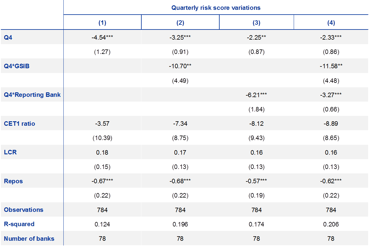 Notes: All the regressions include both time and bank fixed effects. The reported R-squared is the intra-group one. The standard errors in parenthesis are robust and adjusted for clustering at the bank level. Finally, the results reported in column (4) are obtained by simultaneously including both the interaction terms between Q4 and the dummies for G-SIBs and banks with reporting obligations, with the latter group excluding G-SIBs.