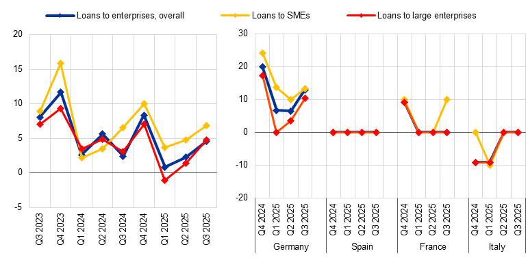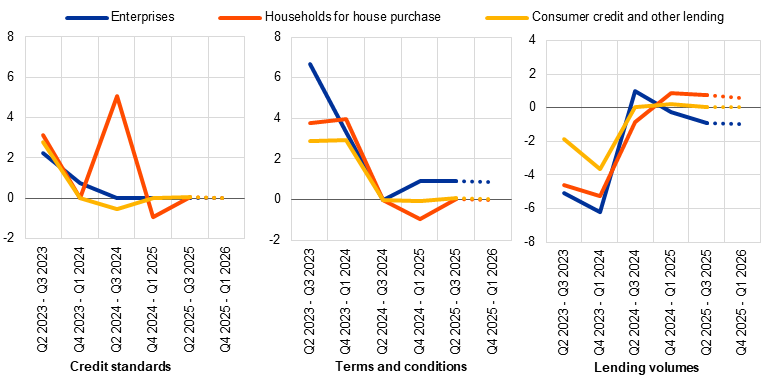 In the fourth quarter of 2025, euro area banks expect broadly unchanged credit standards for loans to firms (net percentage of 1%). Banks expect a small tightening of credit standards for loans to SMEs and large firms (4% and 3% respectively), with broadly unchanged credit standards for short-term loans (1%) and a small tightening for long-term loans (4%).