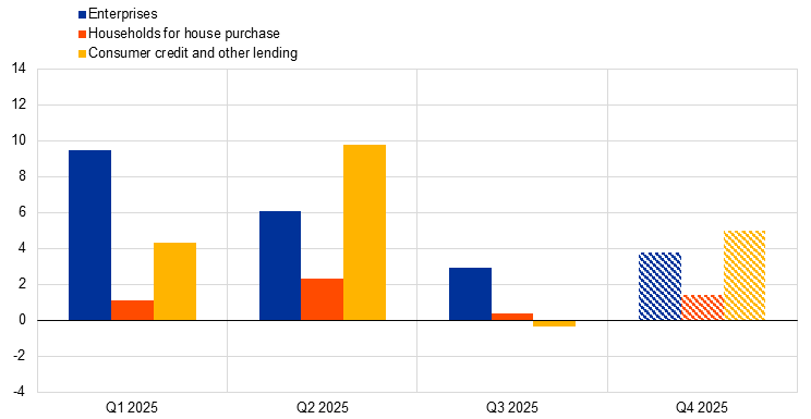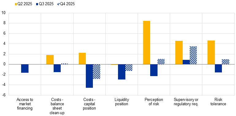 In the fourth quarter of 2025, euro area banks expect a somewhat more noticeable tightening impact of credit quality on their lending conditions for consumer credit and loans to firms, mostly related to supervisory or regulatory requirements. Both credit standards and terms and conditions are expected to be affected, for loans to firms and for loans to households for consumer credit, while no change is expected for loans to households for house purchase. Banks expect higher pressure from supervisory or regulatory requirements to drive this tightening in the next quarter, whereas they reported lower expected costs related to the capital position.