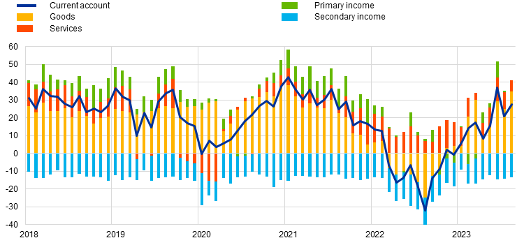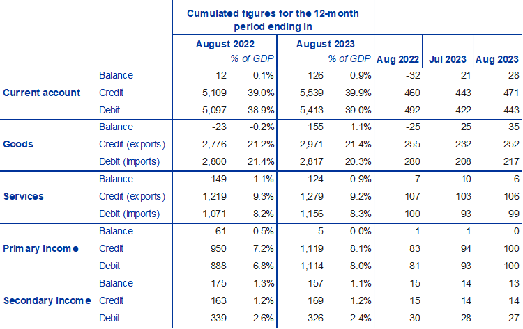 - Current account recorded €28 billion surplus in August 2023, up from €21 billion in previous month