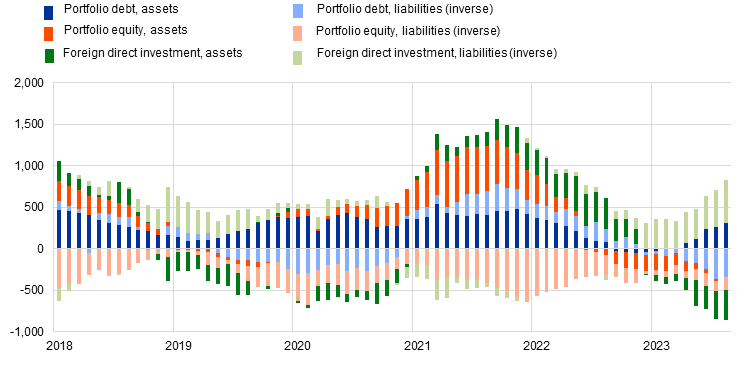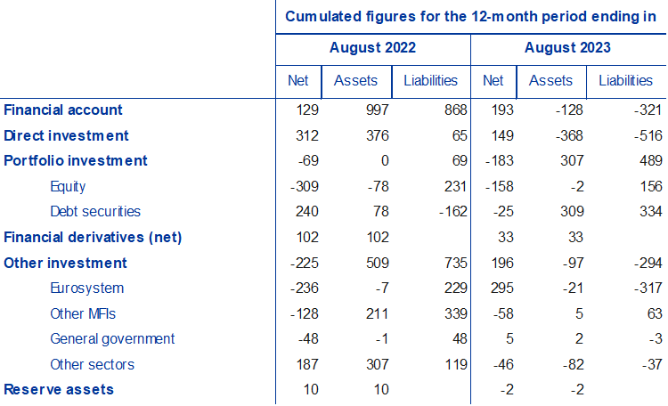 - In financial account, euro area residents’ net acquisitions of non-euro area portfolio investment securities totalled €307 billion and non-residents’ net acquisitions of euro area portfolio investment securities totalled €489 billion in 12 months to August 2023