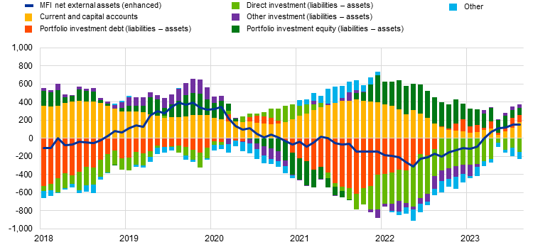 The monetary presentation of the balance of payments (Chart 3) shows that the net external assets (enhanced) of euro area MFIs increased by €150 billion in the 12 months to August 2023. This increase was driven by the current and capital accounts surplus and euro area non-MFIs’ net inflows in portfolio investment debt, portfolio investment equity and other investment. These developments were partly offset by euro area non-MFIs’ net outflows in direct investment and other flows.