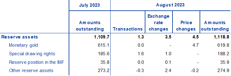In August 2023 the Eurosystem’s stock of reserve assets increased to €1,118.8 billion up from €1,109.7 billion in the previous month (Table 3). This increase was mostly driven by positive price changes (€4.5 billion) and positive exchange rate changes (€3.5 billion) and, to a lesser extent, by net acquisitions of assets (€1.3 billion).