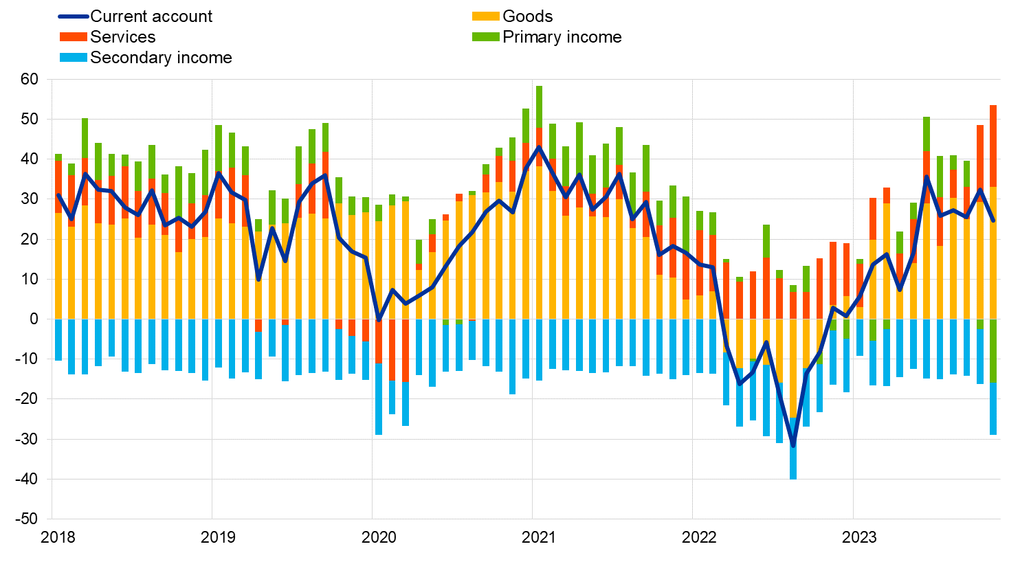 The current account of the euro area recorded a surplus of €25 billion in November 2023, a decrease of €7 billion from the previous month (Chart 1 and Table 1). Surpluses were recorded for goods (€33 billion) and services (€21 billion), while deficits were recorded for primary income (€16 billion) and secondary income (€13 billion).