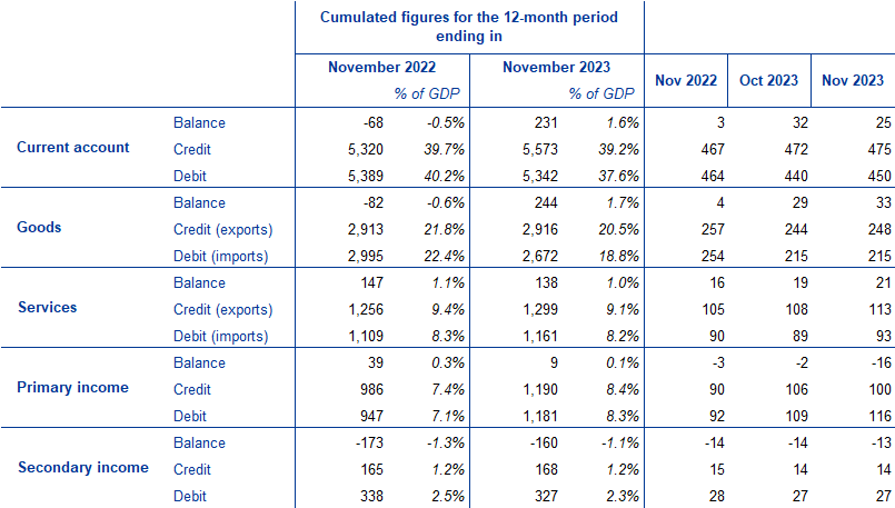 - Current account surplus amounted to €231 billion (1.6% of euro area GDP) in the 12 months to November 2023, after a €68 billion deficit (0.5%) one year earlier