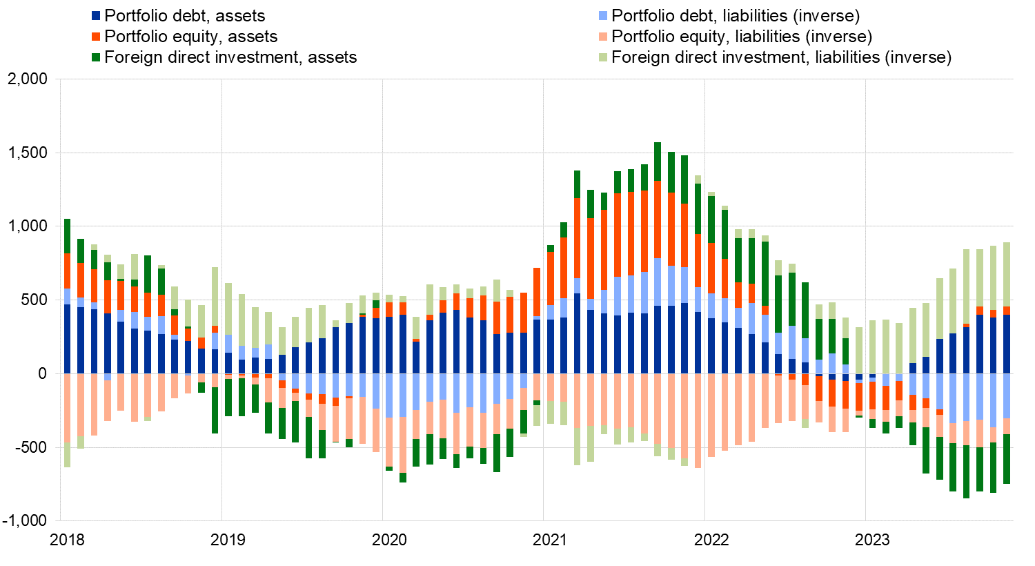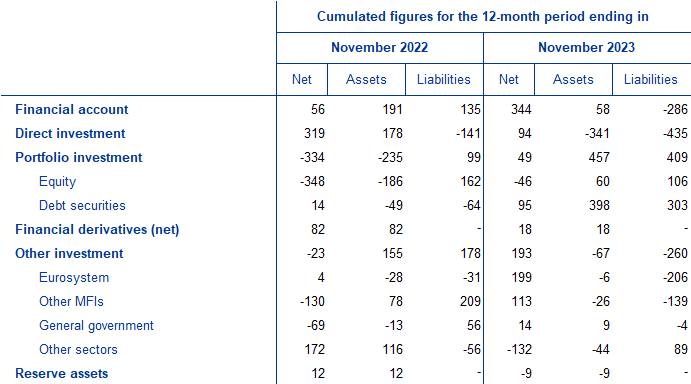 In portfolio investment, euro area residents’ net purchases of non-euro area equity reached €60 billion in the 12 months to November 2023, following net sales of €186 billion one year earlier. Over the same period, net purchases of non-euro area debt securities by euro-area residents amounted to €398 billion, following net sales of €49 billion one year earlier. Non-residents’ net purchases of euro area equity decreased to €106 billion in the 12 months to November 2023, down from €162 billion one year earlier. Over the same period, non-residents made net purchases of euro area debt securities amounting to €303 billion, following net sales of €64 billion one year earlier.