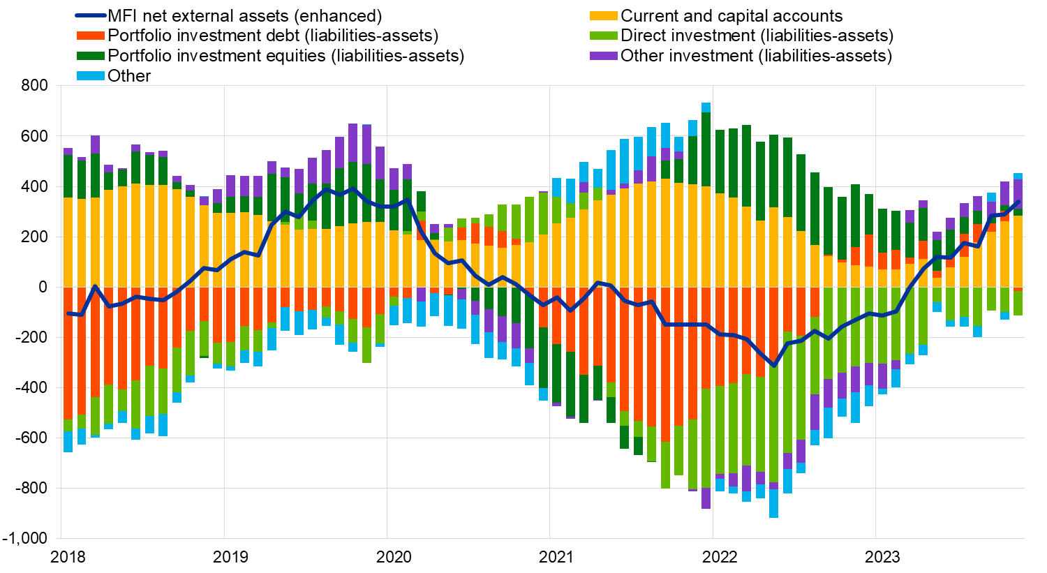 The monetary presentation of the balance of payments (Chart 3) shows that the net external assets (enhanced) of euro area MFIs rose by €338 billion in the 12 months to November 2023. This increase was driven by the current and capital accounts surplus and euro area non-MFIs’ net inflows in other investment, portfolio investment equity and other flows. These developments were partly offset by euro area non-MFIs’ net outflows in direct investment and portfolio investment debt.