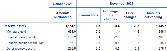 In November 2023 the Eurosystem’s stock of reserve assets decreased to €1,145.5 billion, down from €1,154.1 billion in the previous month (Table 3). This development was driven by negative exchange rate changes (€8.4 billion) and, to a lesser extent, by negative price changes (€1.8 billion) which were partly offset by net acquisitions of assets (€1.5 billion).