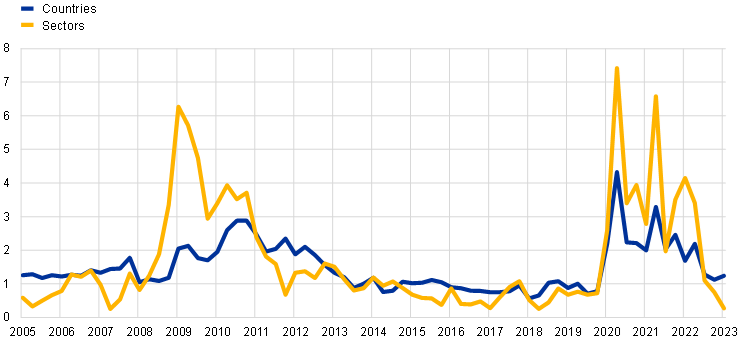 Notes: The cross-country growth dispersion is measured as the weighted standard deviation of year-on-year value-added growth in all euro area countries, excluding Ireland. The cross-sector growth dispersion is measured as the weighted standard deviation of year-on-year value-added growth in manufacturing, construction, contact-intensive services and a combination of other sectors. The cross-country growth dispersion in manufacturing and contact-intensive services is measured as the weighted standard deviation of year-on-year sector-specific value-added growth in all euro area countries, except Ireland. The latest observations are for the first quarter of 2023.