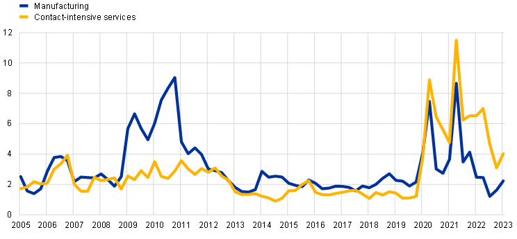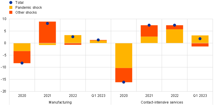 Reopening effects remained a significant driver of the growth differential between manufacturing and contact-intensive services in the first quarter of 2023 but weakened overall compared with 2022. The model-based decomposition of value-added growth in manufacturing and contact-intensive services suggests that the cross-sector differences in the impact of the pandemic shocks have played a large role in the differences in sectoral performance since 2020, with the shutdown and subsequent reopening of the economy having a larger impact on contact-intensive services (Chart C, panel b). At the start of 2023 reopening effects were still present, albeit with smaller growth impulses for both manufacturing and contact-intensive services compared with 2022. At the same time, other shocks have started to propagate to contact-intensive services and have less of an effect on manufacturing growth. The latter is consistent with easing supply-side constraints; however, these may have been offset by lower global and domestic demand, as well as tighter euro area financing conditions.[4]