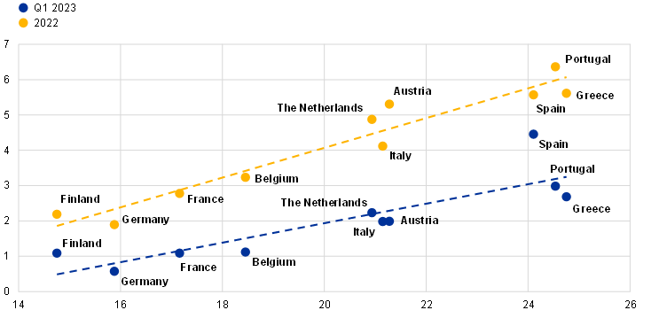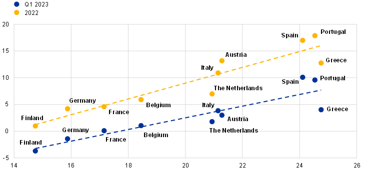 In the first quarter of 2023 economic growth remained higher in countries where contact-intensive services are more important for the overall economy. In 2022, contact-intensive services output grew at a stronger pace in countries where these services account for a larger share of the economy (Chart B, panel a). This partly mirrors the growth pattern following the outbreak of the pandemic, when these countries experienced a relatively sharp economic downturn in contact-intensive services. The relatively strong growth in contact-intensive services in countries where these services are more important continued in the first quarter of 2023, with the level of contact-intensive services in these countries exceeding pre-pandemic levels relatively more than in those where contact-intensive services are less important. This shows that countries with a higher dependence on contact-intensive services continued to benefit to a greater extent from the growth impetus in this sector, which also led to relatively higher value-added growth overall (Chart B, panel b). Conversely, countries with a higher reliance on manufacturing mostly experienced lower growth in total value added in the first quarter of 2023, reflecting the somewhat weaker growth of manufacturing compared with contact-intensive services. However, manufacturing growth in euro area countries was far more evenly distributed, suggesting that the current drivers of manufacturing are being exerted more evenly across euro area countries than those of contact-intensive services.