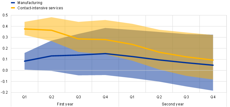 4. Conversely, other shocks explain the more pronounced resilience and faster recovery of manufacturing after the outbreak of the pandemic, which is consistent with the early and strong recovery in global demand for manufacturing goods. This did not, however, fully feed through to manufacturing activity owing to supply chain disruptions and, later, the impact of the energy crisis. Although the shift in global demand from services to goods is related to the pandemic, it is not captured by the identified pandemic shocks per se, as these shocks measure unexpected changes in people’s mobility and do not necessarily capture unexpected changes in their consumption preferences. However, the weaker response of manufacturing relative to contact-intensive services because of an unexpected change in mobility may to some extent be related to a reallocation of people’s consumption from services to goods, thus partially explaining the weaker impact of the mobility shock on manufacturing relative to contact-intensive services value added.