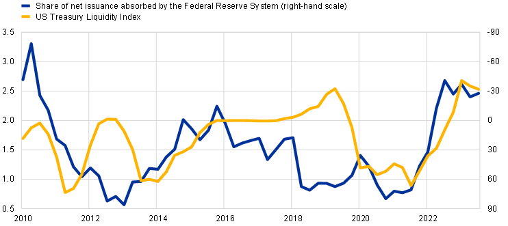 Recently, liquidity in the US Treasury market has declined owing to a combination of factors. Chart A (panel a) shows the evolution of bond market liquidity in selected advanced economies, including the US Treasury market, as measured by the “spline spread”, which is the average fitting error in a yield curve. This spread serves as a proxy for the extent of arbitrage opportunities in a bond market, with higher values being associated with lower market liquidity.[1] The smooth functioning of the US Treasury market has been challenged on a number of occasions in recent years, particularly in March 2020 at the onset of the pandemic. More recently, monetary policy tightening (including reduced absorption of US Treasuries by the Federal Reserve System, as shown by the blue line in Chart A, panel b) and elevated uncertainty about inflation and growth are likely to have contributed to declining liquidity and increased the sensitivity of US and global sovereign bond markets.[2]