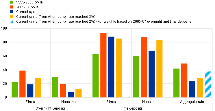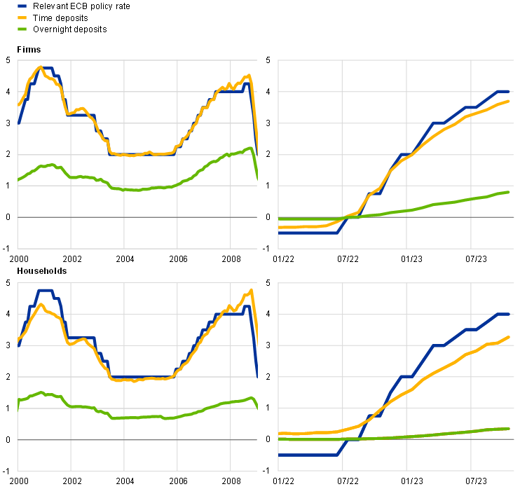 Accumulated changes in deposit rates have been relatively weak, partly because deposit rates were above the policy rate during the time of negative interest rates preceding the current cycle, but also because of a genuine weaker transmission to overnight deposit rates for households. The ratio of the increase in deposit rates to the increase in policy rates is a measure widely used to compare the strength of the interest rate pass-through to deposit rates across tightening cycles. This ratio is usually referred to as the deposit beta. However, this measure is sensitive to the starting point, especially if the spread between the deposit rate and the policy rate at that point differs from the historical norm. This was the case at the beginning of the current tightening cycle as, in mid-2022, the spreads between deposit rates and policy rates were negative (Chart A, panel a, right graph). These inverted deposit spreads reflect the fact that banks were reluctant to pass on the negative interest rates to their retail depositors because of legal barriers and litigation risks or concerns about deposit withdrawals.[5] The end of the period of negative and very low interest rates allowed the spreads between the policy rate and the deposit rates to return towards their historical patterns, marking a period when policy rate hikes were matched by only minor increases in deposit rates. For this reason, it is important to exclude the period of low policy rates when using deposit betas to compare the strength of the deposit rate pass-through against past episodes. It would be possible, for example, to exclude the period when the policy rate was below 2%, the level at the start of the previous cycle. If this is done, deposit betas increase for all overnight deposits, as well as for those time deposits held by households. The fact that firms and households currently hold a higher share of overnight deposits than they used to is another factor that affects aggregate deposit betas, i.e. those that weight deposit rate increases across various deposit types based on their outstanding amounts (Chart B, panel b). Using the deposit shares from the 2005-07 tightening cycle (instead of the current shares) to blend the remuneration on overnight deposits and time deposits causes the resulting deposit beta to approach that of the previous hiking cycles, although it still remains somewhat lower (Chart A, panel b). This is mostly due to the genuinely weaker transmission of policy rate hikes to overnight household deposits.
