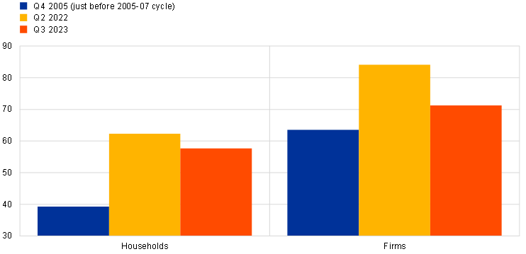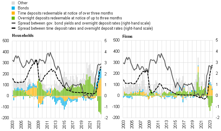 The increased remuneration of time deposits and bonds after a long period of low or negative interest rates has incentivised shifts to these instruments from overnight deposits and other low-remuneration deposits. During the period of low interest rates, the opportunity cost of holding overnight deposits was very low, causing households and firms to accumulate virtually all of their new money balances in overnight deposits (Chart B, panel a). The current monetary policy tightening, and its transmission to deposit rates and yields on other financial assets, has increased the opportunity cost of holding overnight deposits to levels similar to those seen in previous hiking cycles. This has led firms and households to move a significant portion of their unusually large stock of overnight deposits to time deposits and bonds. That stock has contracted compared with mid-2022 but remains high by historical standards. This is all the more evident for households than for firms (Chart B, panel b),[6] which could explain the moderation in deposit shifts by firms observed over the past two quarters.