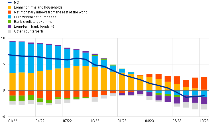 The current monetary policy tightening has weakened broader money creation, pushing it into negative territory at a historically low level. Since the current tightening cycle started, higher interest rates have brought down both loan demand and loan supply considerably. This has drastically reduced credit volumes, which is a typical source of money creation. Furthermore, the contraction of the Eurosystem balance sheet has reinforced the decline in credit supply and has had a direct dampening effect on M3 via two channels: (i) TLTRO repayments, which incentivise banks to issue long-term bonds, thus reducing money balances as depositors acquire these bonds; and (ii) the progressive redemptions of the asset purchase programme portfolio, which remove money from circulation.[9] As a result, the contribution to annual M3 from loans to firms and households fell from 4 percentage points in mid-2022 to around zero in October 2023, while bank bond issuance is currently sapping around 1.5 percentage points from the annual M3 stock. The direct contribution from Eurosystem purchases turned negative, from close to 6 percentage points in early 2022 to -1 percentage point in October 2023. This has, however, largely been offset by purchases of government bonds by foreign investors, although household purchases of bonds are currently weighing somewhat on monetary dynamics. The recovery in the current and capital accounts surplus, which also reflects the weakening of domestic demand for foreign goods, has also further supported net monetary inflows from abroad since late 2022 (Chart C, panel a).
