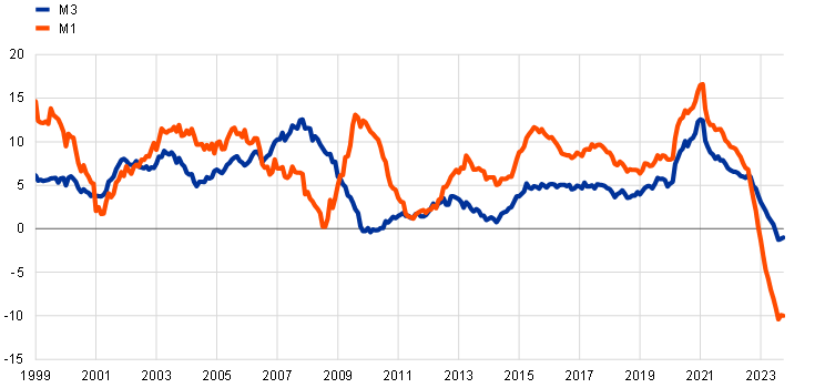 Deposit shifts and the contraction of broad money have resulted in negative growth of unprecedented size in the narrow monetary aggregate M1. As overnight deposits are the main component of M1, shifts away from them have resulted in an unprecedented contraction of this aggregate (by roughly 10% since the summer; Chart C, panel b). Given that M1 growth has historically been a good predictor of real GDP growth, this has raised concerns about a further slowdown in economic activity.[10] In part, this connection operates via consumption, savings and investment decisions, because M1 is a relevant indicator of the degree of liquidity in the economy. In the current situation, however, the ongoing shift away from overnight deposits and the previous strong growth of M1 since 2015 – which was largely linked to the combination of net asset purchases and low interest rates – may be blurring the usual signal. In other words, a reduction in M1 resulting from a portfolio shift away from overnight deposits should, in principle, have a more contained impact on agents’ spending capacity. It should therefore have a smaller negative impact on GDP than that of a typical decline in M1, particularly given that the stock of overnight deposits remains relatively high by historical standards. However, this does not mean that M1 should be dismissed altogether, especially if accompanied by tensions in financial markets and heightened demand for liquidity.