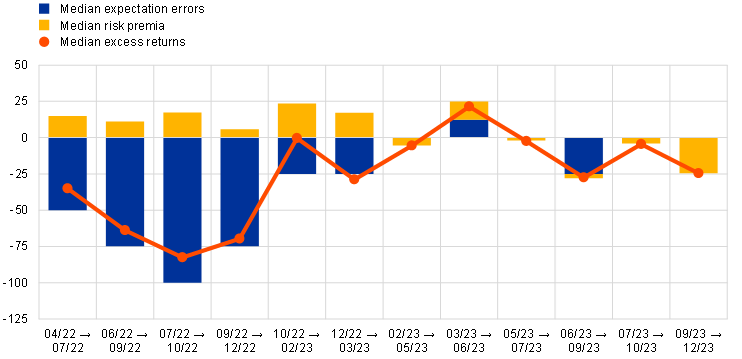 Notes: SMA expectations are used to decompose ex post excess returns (measured as the difference between €STR forward rates and the realised deposit facility rate into risk premia (approximated by the difference between the €STR forward rates and SMA DFR expectations) and expectation errors (the difference between the SMA DFR expectations and the realised DFR)