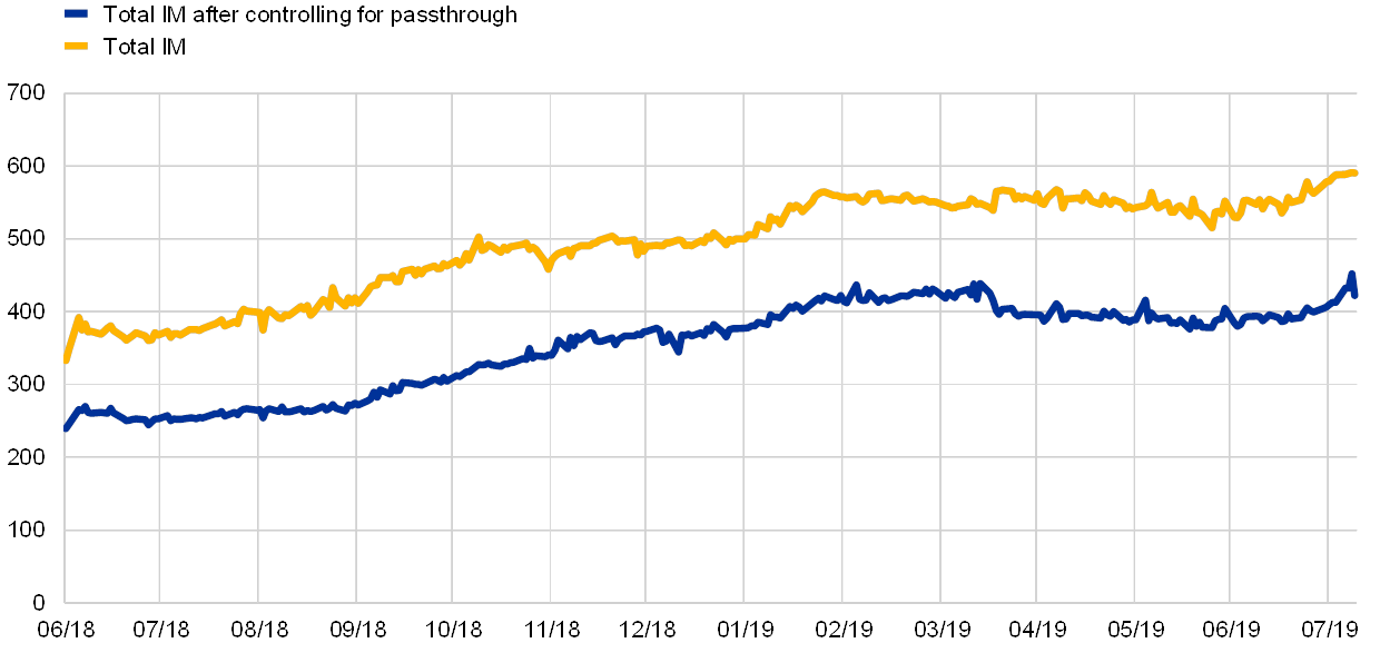 Notes: IM stock is calculated by summing up paid and received IMs for all euro area counterparties. Double counting is avoided by only accounting for the paid IM in those cases where the receiving counterparty has also reported the IM. The effect of IM pass-through is approximated by subtracting 75% of the IM that is paid by clients to clearing members for cleared transactions from the amount of total IM.