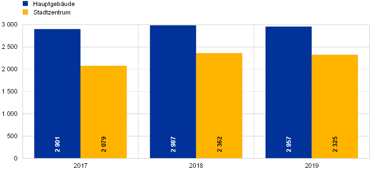 Die vorliegende Umwelterklärung enthält Umweltdaten zu den Gebäuden, die die EZB im Jahr 2019 nutzte, d. h. zum Hauptgebäude, zum Eurotower und zum Japan Center. Da die Zahl der Arbeitsplätze in den letzten Jahren sukzessive gestiegen ist, nutzt die EZB seit 2018 sämtliche Büroflächen in den drei Gebäuden. Die Anzahl der Arbeitsplätze stabilisierte sich 2019; im Vergleich zum Vorjahr wurde ein Rückgang um 1,3 % verzeichnet.