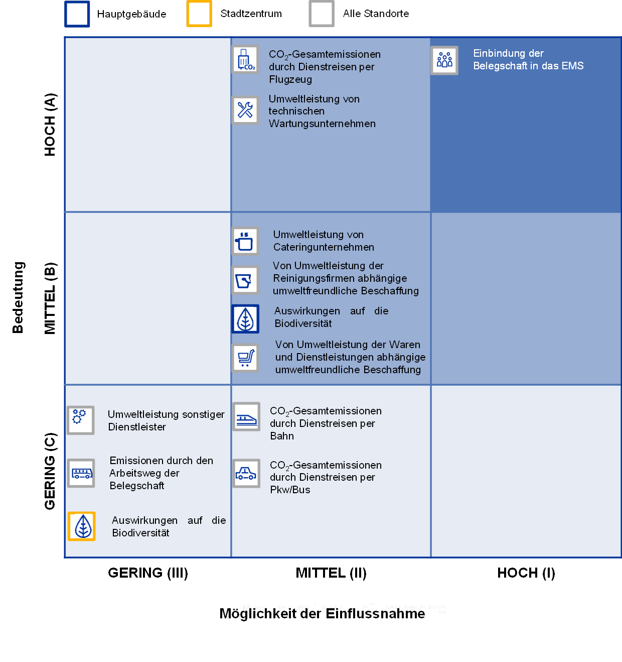 Die direkten und indirekten Umweltaspekte werden regelmäßig bewertet. Dabei wird untersucht, inwiefern sie beeinflussbar sind (X-Achse) und welche Bedeutung sie jeweils für die Umweltleistung der EZB haben (Y-Achse). Nachstehend ist das Ergebnis der jüngsten Bewertung zusammengefasst. Nach Bewertung der direkten Umweltaspekte der EZB wurde die Bedeutung des Frischwassers im Hauptgebäude von mittel auf hoch heraufgestuft, da die Daten zum Wasserverbrauch im Jahr 2019 zeigten, dass der Wasserverbrauch 2019 zwar allgemein gesunken ist, die entsprechenden Daten jedoch enger überwacht werden müssen. Nähere Informationen zur Entwicklung des Wasserverbrauchs findet sich in Kapitel 3.3 – Wasser und Abwasser.