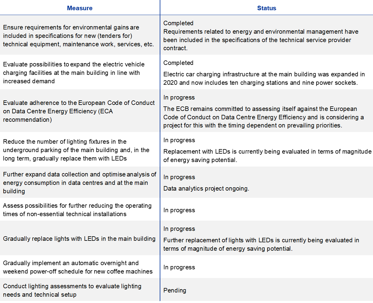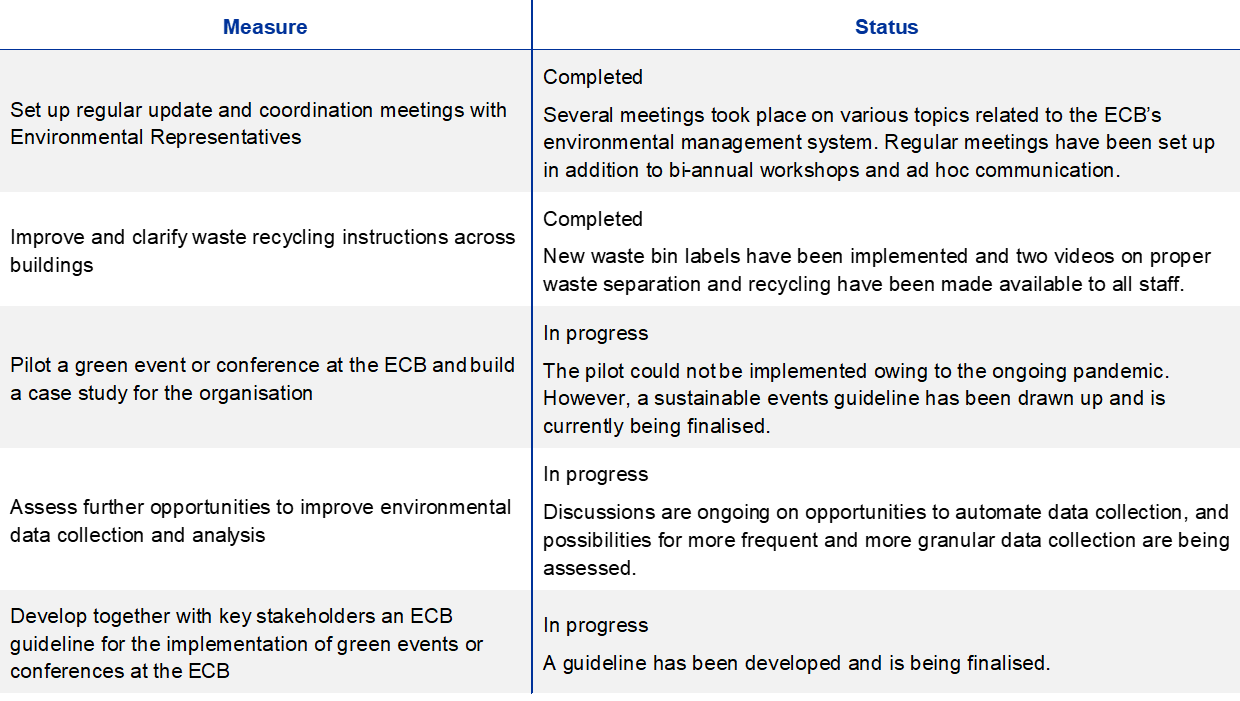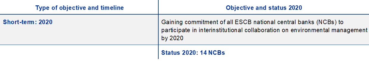 The ECB’s environmental policy encapsulates the ECB’s commitment to environmental protection and gives direction to its environmental efforts. Further information on the ECB’s environmental policy and EMS governance can be found on the ECB’s website.