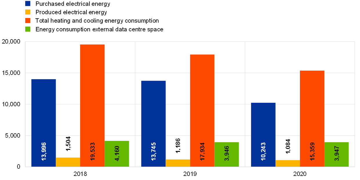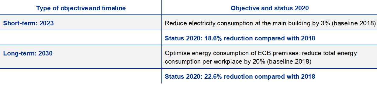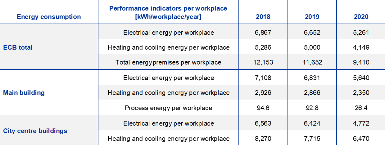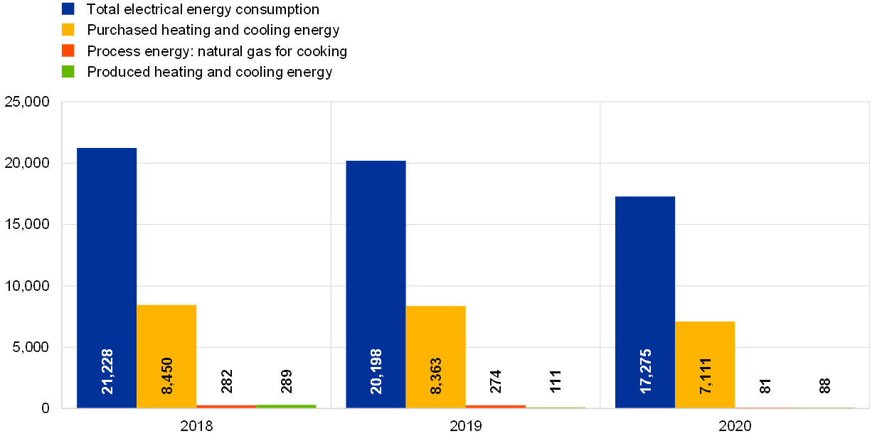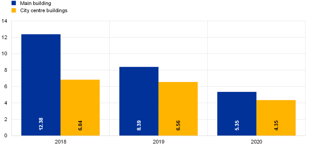 In 2020 energy consumption in ECB premises decreased by 16.9% compared to 2019 owing to the low occupancy of all buildings. Various energy efficiency measures were implemented which supported this decline, such as further substituting lighting in the main building and the Japan Centre with LED lighting. In addition, the ECB continued its participation in an energy efficiency network with the aim of continuously identifying further energy saving potential. Nevertheless, it is recognised that some of the energy consumption shifted to the employees’ homes as the remote working regime lasted for most of the year.