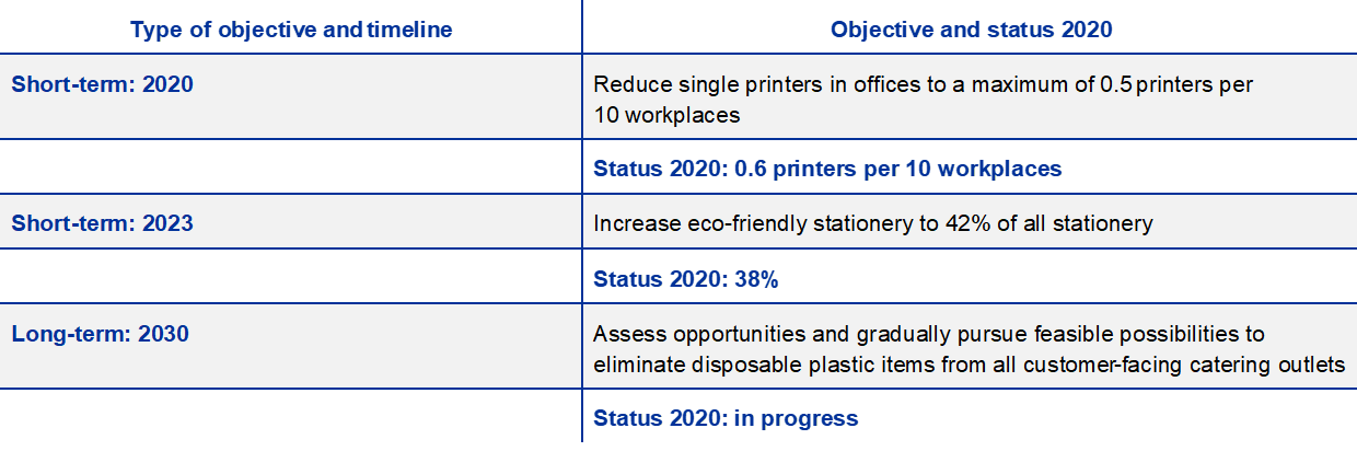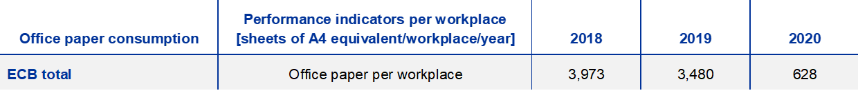 Efforts to reduce the number of single office printers continued in 2020, with various communications having been launched at senior management and staff level. Significant reductions were realised and the number of printers was reduced to 0.6 individual printers per ten workplaces. Although the objective of 0.5 printers per ten workplaces by 2020 was narrowly missed, the ECB remains committed to phasing out its individual printers, except for a limited and justified number of printers that are required for business purposes.