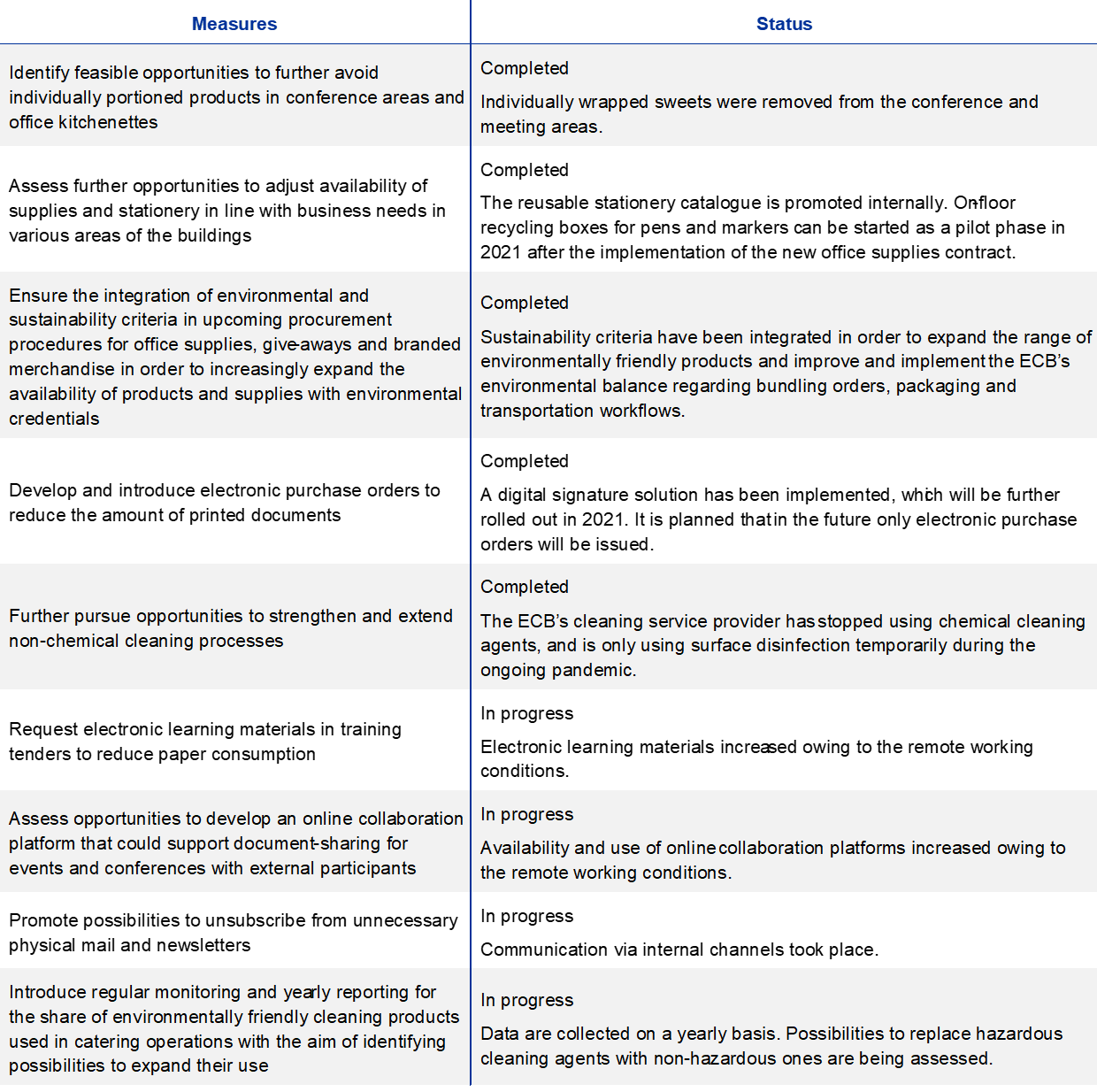 In addition, the ECB's internal catalogue for reusable stationery has contributed to a decline in new external orders and ECB staff have been advised on how to limit the environmental impact of stationery and office supply orders.