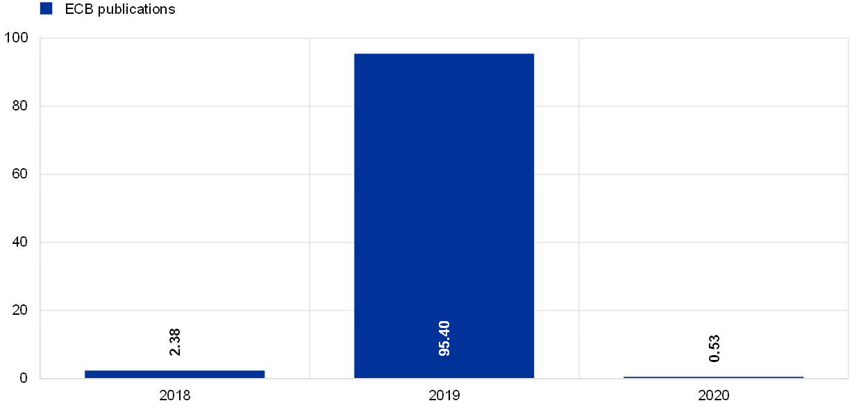 Paper consumption for official publication is characterised by strong fluctuations related to the number of external communication campaigns. In 2019 there was a rebound in paper consumption for official publications owing to the introduction of the new €100 and €200 banknotes and the publication of related information material. By contrast, in 2020 paper consumption for official publications at the ECB dropped significantly to 0.53 tonnes.